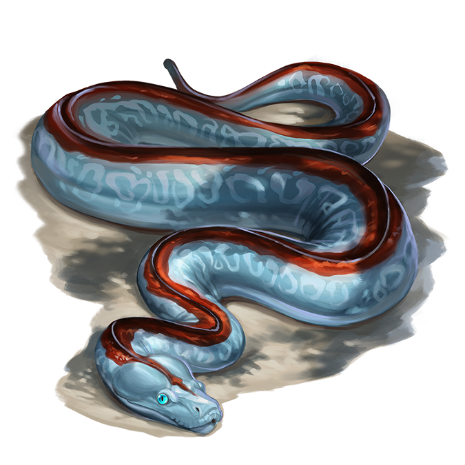 Commonly known as ghost serpents, zinbas are rare, amphibious snakes with healing abilities. They're of similar size to other large snakes, such as pythons, but have a distinct bright blue coloring with red-and-black patterned stripes along their backs. This distinct coloration is easy to spot, but zinbas can swim through the wet mud and soft earth of their homes to avoid being tracked by all but the most skilled pursuers. This elusiveness inspires their “ghost serpent” moniker.