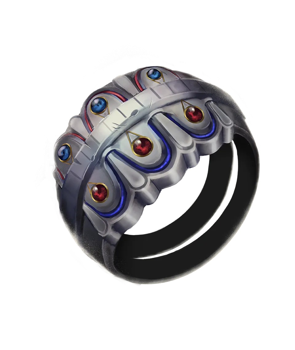 This ornate silver ring bears two competing geometric designs of brightly colored and wildly clashing inlaid gemstones. A spellcaster can cast a single spell into this ring as long as no spell is currently stored within, expending the normal time, costs, and so forth to Cast the Spell. The spell’s effect doesn’t occur; the spell’s power is instead stored within the ring.