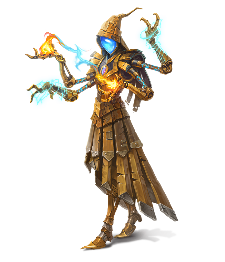 A clockwork mage is a lethal blend of magic and machinery. Each of these clockworks is imbued with an arcane stone at its core that powers spells through the wand embedded in its chest.
