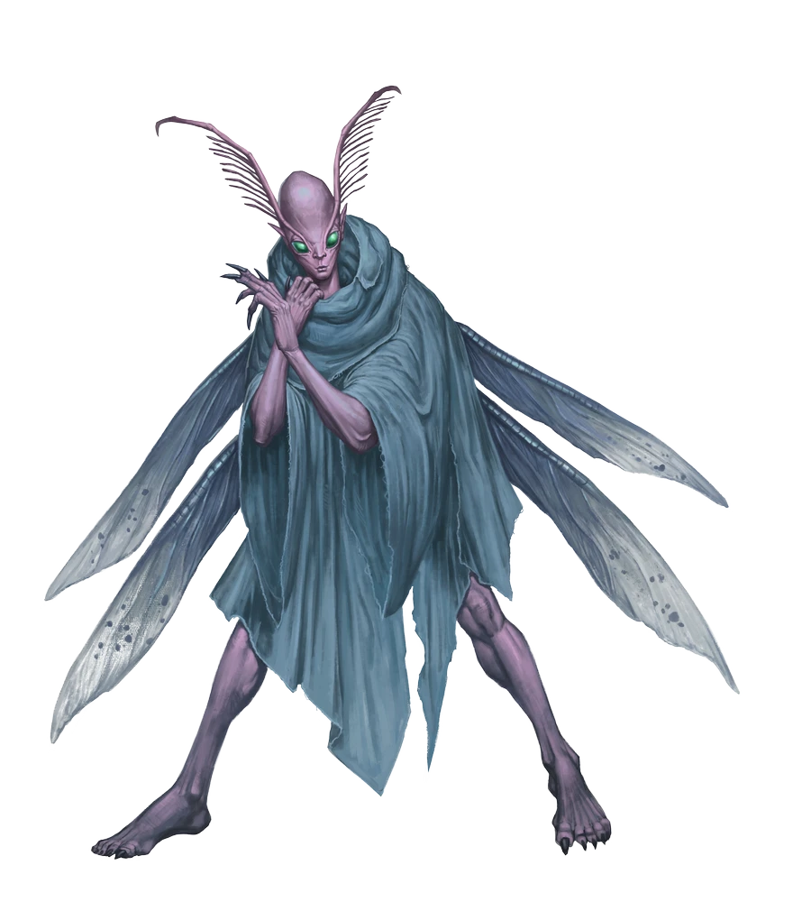 An imprecasia, commonly known as a curse eater, is a solitary fey drawn to the energy emanating from curses. They appear as emaciated humanoid creatures with shadowy wings, long thin hands with sharp claws, and insectile heads with feathery antenna.