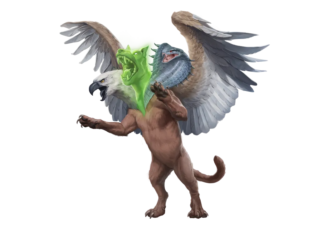 The chimera heads presented below can replace one or more of the heads in the chimera stat block presented in Monster Core. To do so, use the Strike entry listed in the replacement head instead of the one in the original stat block; if you replace the dragon head, you must remove the creature's Dragon Breath ability. However, each of the new heads below grants new abilities.