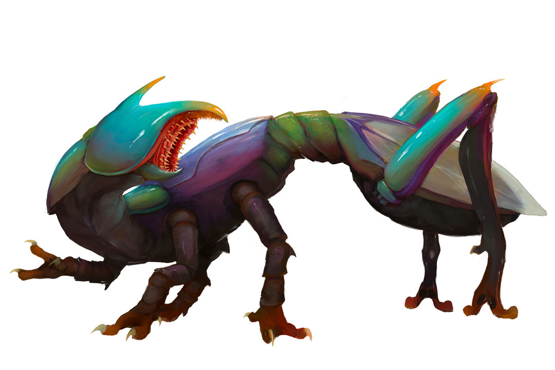 Kareqs are thought to be related to Golarion's destrachans, though their similarities may simply be the result of convergent evolution. Unlike the stronger subterranean destrachans, kareqs are native to a variety of different environments, most often jungles and forests. A few sandy-colored species are found in the deserts of the Colonies, where formians regard the beasts as noble or, in some cases, practically sacred.