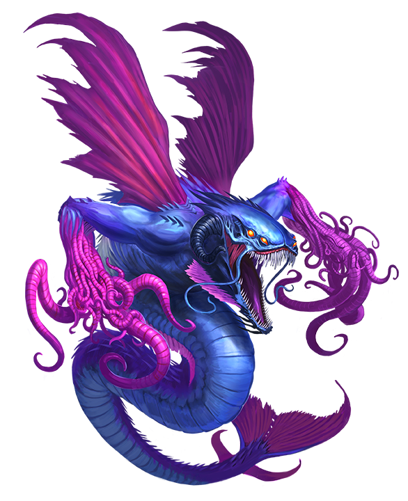 Sarglagons dwell in Hell's myriad waterways, lakes, and oceans. They serve as guardians of the Academy of Lies—the repository of secrets in Stygia, the fifth layer of Hell. Sarglagons breathe water and air with equal ease, and can move through water, land, and even air with uncanny swiftness. Few fiends travel the waterways of the multiverse, but where a river crosses the planes, odds are sarglagons have traveled it to further their infernal machinations. The only body of water they avoid is the River Styx, as the fiends have yet to develop any defense against that waterway's memory-sapping qualities. Mortal spellcasters sometimes bind sarglagons as guardians of precious secrets or treasures, particularly in aquatic areas. Most strangely, sarglagons sometimes act as unnerving caretakers to mortals who have no idea what they did to earn their unwanted protectors' attention. The constant uninvited vigilance of these devils is often disturbing and stifling to their wards.