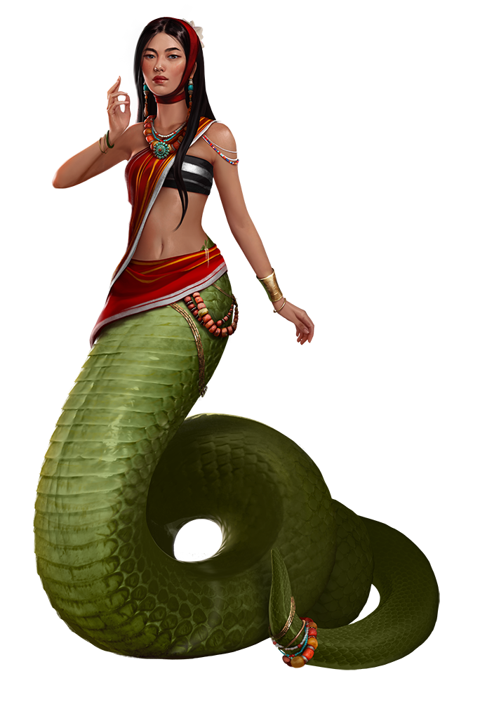 Nagaji originated in the Tian Xia region of Nagajor. Though they have since spread across Golarion to regions such as Vudra and Jalmeray, many of them still carry traditions from their ancestral homeland. Tian and Vudrani concepts of elements, medicine, and spirituality are highly common among nagaji, especially given their tendency of seeing themselves as highly pious beings. Nagaji mostly eschew the human concept of castes, beyond the vague view of a “natural order” that sees nagas as holy guides to mortal nagaji, but they can see the appeal of the concept of karma and the righteousness of fulfilling their proper role in the universe. While they have little physical need for clothes, as they stick to hot and humid environments, nagaji wear them with pride and treat them as decorative elements in the same manner as jewelry.
