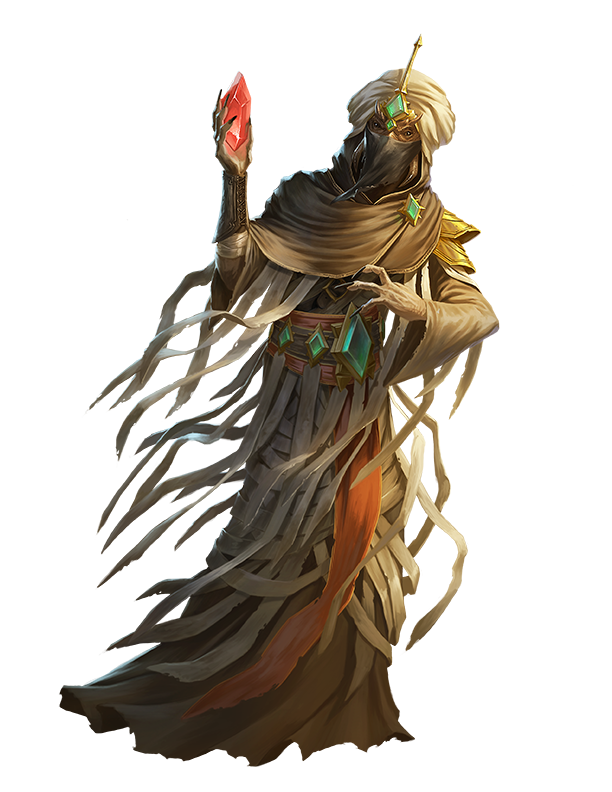 Slavers and raiders from the cold, windswept dimension of Leng, these malevolent humanoids range across reality in ominous black ships capable of sailing beyond the borders of dimensions and planes. Although most denizens of Leng seek slaves and plunder like any pirate, others operate as self-styled ambassadors and merchants, sowing discord with far-ranging plots. While the inscrutable denizens dress themselves in flowing robes, veils, and broad turbans to appear human, their aberrant physiology, when glimpsed, is evident from their crown of stubby horns and tentacled jaws to their furry, goat-like legs.