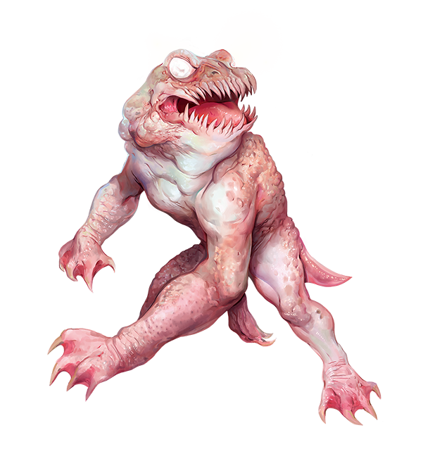 Inhabitants of damp, subterranean caves, blindheims resemble stubby humanoids with oversized, frog-like heads and bulbous eyes. Their eyes emit a soft glow at all times, but a blindheim can draw back the heavy membrane that normally covers them to emit an intense light as bright as day. These simple creatures use their lights to draw in or disorient prey, mostly small animals like lizards, rodents, or fish. However, they might go after larger prey if trying to feed their young. When they encounter creatures their own size or larger they retreat, flashing their eyes to facilitate their escape if necessary. They often hunt in pairs or small packs. Using their lights to coordinate from a distance, they slowly close in on the creatures they hunt. One common hunting pattern involves one blindheim diving deep and using its light to chase fish to the surface, while another up above snatches them up and tosses them onto the land to eat later.