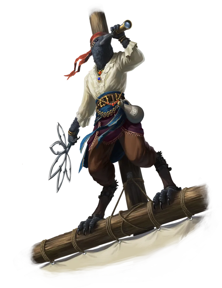 The tengu diaspora has spread across Golarion in search of a better life, bringing their skill with blade crafting to lands far from their home. In maritime regions, tengu notably work as fishers, blacksmiths, and “jinx eaters”— members of ships' crews who are believed, accurately or otherwise, to absorb misfortune. Having lived in a variety of conditions and locations, tengu tend to be nonjudgmental, though their willingness to associate with lawbreakers has often led some to regard them with suspicion.