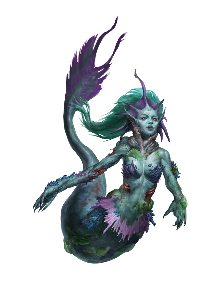 Obrousians are recognizable as the merfolk they were in life, though their bodies show obvious decay and their hands have elongated into sharp claws. Their voices are melodic and entrancing, belying their rotting bodies and turbulent minds, so some obrousians hide in tall reeds or under docks before speaking to their victims, lulling them into false comfort with a pleasant voice.