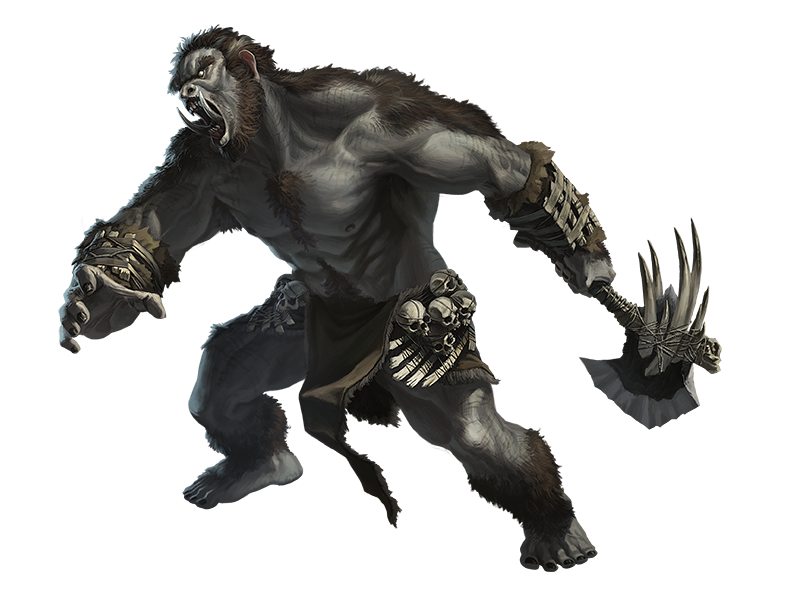 Cave giants are the vicious loners of the giant world. Even their closest ancestral kin, the rampaging hill giants, mostly find cave giants too brutal and antisocial to form alliances with. For their part, cave giants—garbed in stinking hides festooned with the rotting skulls of their victims—seem ambivalent about their foul reputation. They are more interested in hunting and killing their next meal than forming alliances.