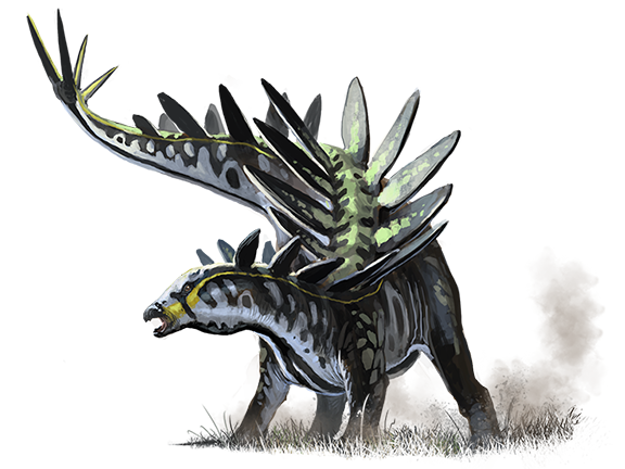 The stegosaurus is easily recognized by its twin rows of diamond-shaped dorsal plates that run down its spine, and thick tail adorned with four large spikes. This strange configuration protects this herbivore from predators, as the stegosaurus can hunker down to interpose its dorsal plates between an attacker and its thick body. A stegosaurus defends itself by swinging its spiked tail at larger foes and trampling smaller opponents underfoot.