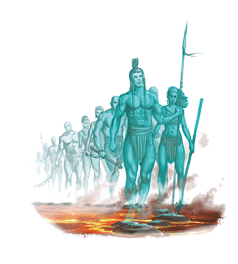 True to their name, nightmarchers tend to walk royal highways only after nightfall, making daytime travel safer. While they can traverse virtually any barrier, they can't cross ti leaves or similar sacred plants. If one finds themself in nightmarchers' presence, the last recourse is to show proper deference by lying flat on the ground with eyes shut—if one hears a ghostly voice call out to claim them, it means that an ancestor is present among the nightmarchers and has directed the procession to spare the bystander from harm.