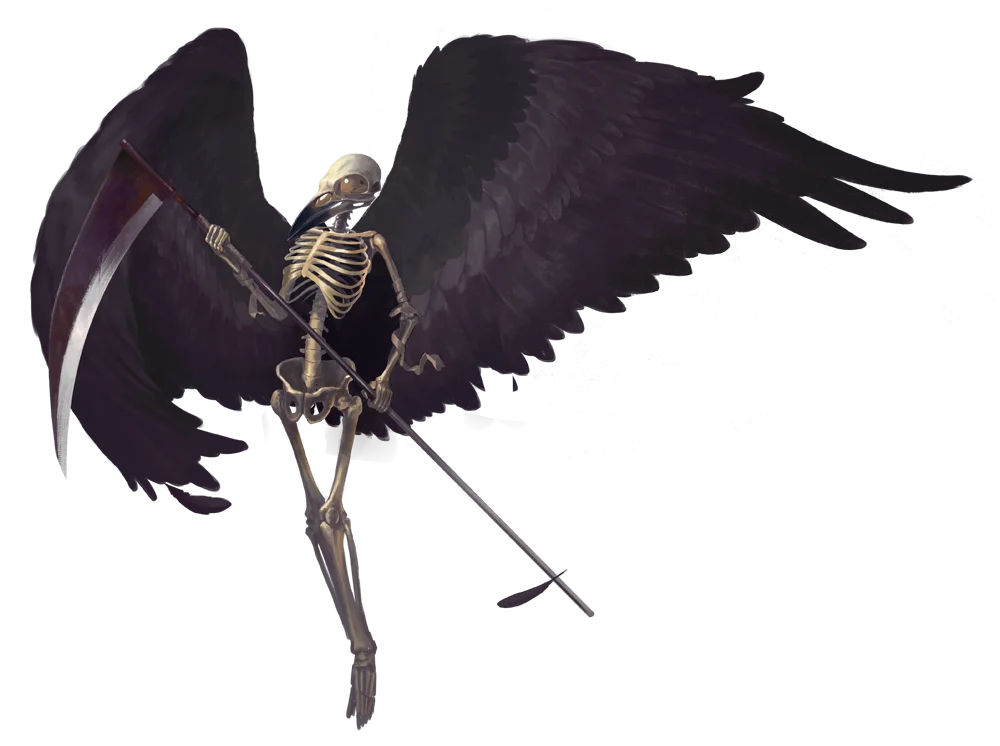 Protectors of the Boneyard, the stern and resolute guardians of the dead, vanths are psychopomps who resemble skeletons with raven-like wings and a mask resembling a vulture's skull. Vanths carry black scythes to fight against those who would disturb the natural progression of souls, and they consider any visitor to the Boneyard a potential troublemaker. They rarely speak and even more rarely show any emotion other than a grim adherence to duty.