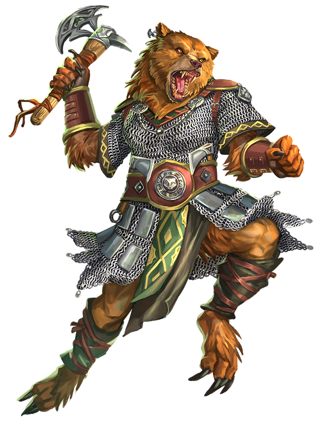 Melee [one-action] claw +13 [+9/+5] (agile, reach 10 feet), Damage 1d10+7 slashing plus GrabMelee [one-action] greataxe +13 [+8/+3] (reach 10 feet, sweep), Damage 1d12+7 slashingMelee [one-action] hatchet +13 [+9/+5] (agile, sweep), Damage 1d6+7 slashingMelee [one-action] jaws +13 [+8/+3] (reach 10 feet), Damage 1d12+7 piercing plus curse of the werebearRanged [one-action] hatchet +10 [+6/+2] (agile, sweep, thrown 10 feet), Damage 1d6+7 slashingChange Shape [one-action] (concentrate, polymorph, primal, transmutation) Medium human with fist +13 for 1d4+7 bludgeoning, or grizzly bear with Speed 35 feet.Curse of the Werebear (curse, necromancy, primal) This curse affects only humanoids. Saving Throw DC 22 Fortitude save. On each full moon, the cursed creature must succeed at another Fortitude save or turn into a werebear until dawn. The creature is under the GM’s control and goes on a rampage for half the night before falling unconscious until dawn.Hunt Prey [one-action] (concentrate) Requirements The werebear can see or hear the target or is Tracking it in exploration mode. Effect The werebear gains a +2 circumstance bonus to Perception checks when it Seeks its prey and a +2 circumstance bonus to Survival checks when it Tracks its prey. The werebear also ignores the penalty for making ranged attacks within its second range increment against the prey it’s hunting. The werebear can designate only one creature as its hunted prey at a time. If it uses Hunt Prey against a different creature, the prior creature loses the designation and the new prey gains the designation. In any case, this designation lasts until the werebear’s next daily preparation.Mauler The werebear gains a +2 circumstance bonus to damage rolls against creatures it has grabbed.Moon Frenzy (polymorph, primal, transmutation) When a full moon appears in the night sky, the werebear must enter hybrid form, can’t Change Shape thereafter, becomes one size larger, increases its reach by 5 feet, and increases the damage of its jaws by 2. When the moon sets or the sun rises, the werebear returns to humanoid form and is fatigued for 2d4 hours.Precision Edge The werebear deals 1d8 additional precision damage on its first successful Strike against its hunted target on each of its turns.
