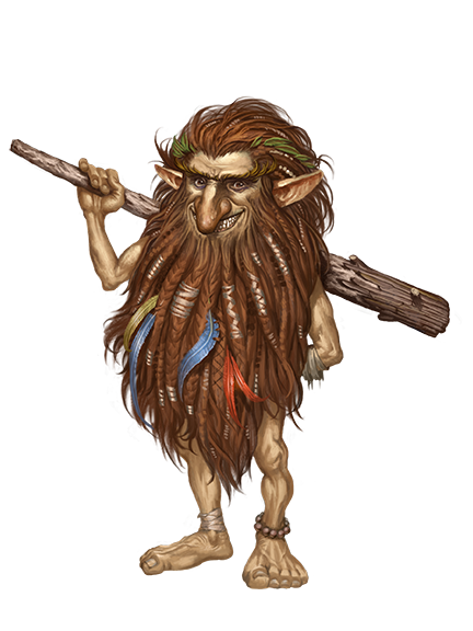 Korreds are reclusive fey in the form of small, hirsute individuals with long, animated manes of hair. While korreds have a natural affinity and admiration for stones and boulders, they prefer to dwell aboveground in areas of rocky forest or wooded hills rather than in caves. Korreds are a private people who don't take kindly to intruders, and they invariably work to drive off or kill any non-fey who stumble into their territory. Staunchly proud of their hair, korreds choose their minimal attire so as to allow their body hair to flow freely, often wearing only a belt with a pouch for throwing rocks and trimming shears—though this belt and pouch are rarely visible under their wild manes.