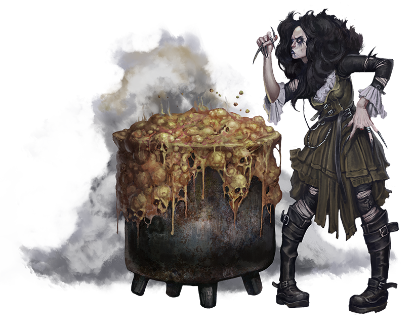 Away from the sheltering shadows of the Axan Wood and the protection of her mother, Kepgeda knew it safest to form a coven of her own. Her mother, after all, was part of a coven, though Kepgeda rarely met its other members, and then only at a distance. So Kepgeda sought out two companions. It didn't take long to find others living in Graydirge with an interest in foul necromancy and occultism. Kepgeda's new “sisters” included a dhampir human witch named Samaygdi and an aging human necromancer named Naunylet. Neither of them lived up to her expectations, so Kepgeda dismembered and cooked each of her sisters alive. She bound their screaming souls to the cauldron they'd shared. Now, she draws on their souls' power to fuel her necromancy.