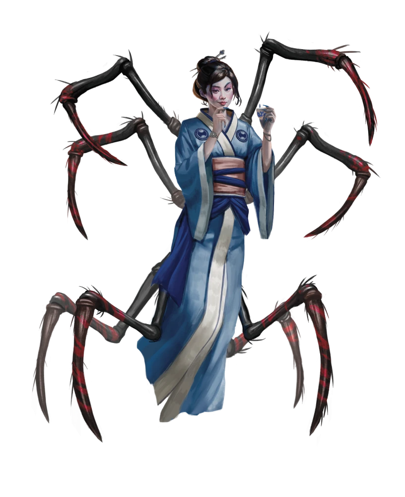 Born in the palace-city of Yin-Sichasi, Ren Mei Li was immersed in the whispering intrigues of the jorogumo from the time she opened her eyes. Soon after reaching her majority, however, she became disillusioned with her sisters' ways, chiefly because it impeded her ability to indulge her preferred tastes. When the jorogumo court seized control of Shenmen at the onset of the Age of Lost Omens, Ren Mei Li was as cruel and manipulative as her sisters, but time would see these traits change.
