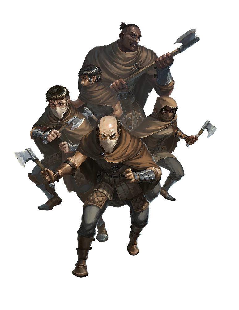 Cutthroat crews of criminals form gangs to take out larger scores and intimidate their victims. Bandit gangs are often accompanied by a gang leader.