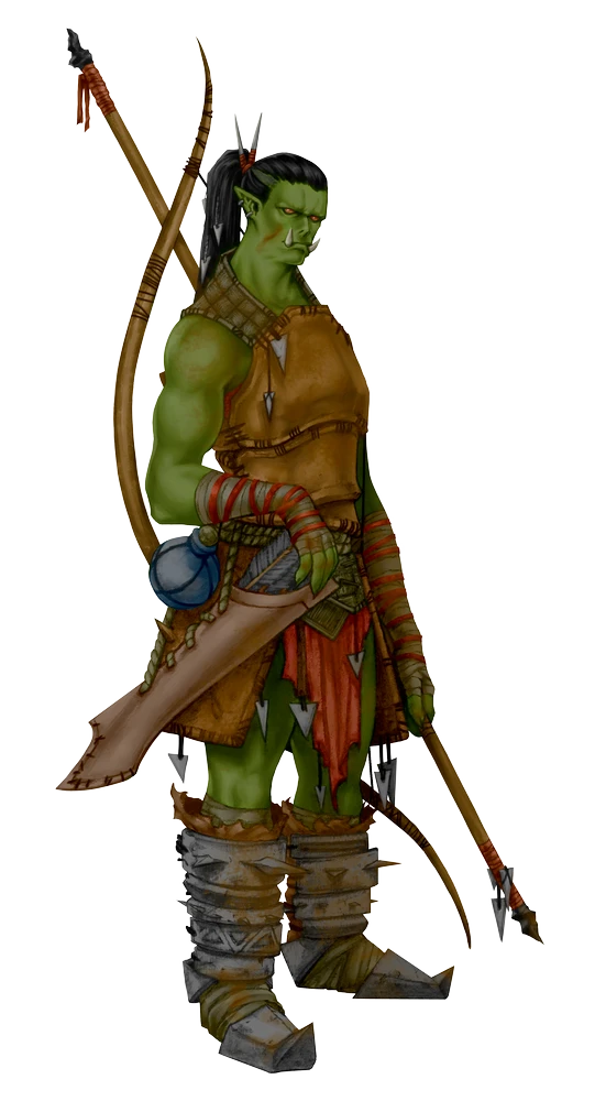 Tall and powerful, with long arms and thickly muscled legs, many orcs top 7 feet in height. Their heavy limbs and broad, almost bow-legged stances combine with a tendency to slouch forward to create an almost contradictory set of circumstances where an orc can tower over other humanoids while simultaneously staring them in the eye. These features, alongside a tendency to scar easily, can make them seem quite intimidating.