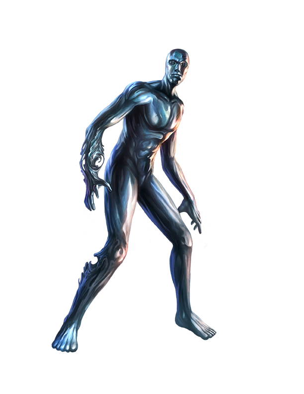 Mithral golems are gorgeously crafted, silvery humanoids made from colossal amounts of the purest mithral. While massive in construction, they possess amazing speed and grace through literal fluidity. Unpredictable and flexible, they can melt into liquid form and reform into a solid shape in mere seconds, allowing them to shape their limbs into sharp spikes or heavy fists as needed.