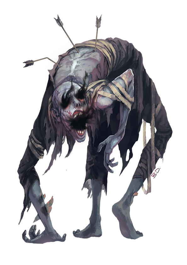 A monk who violated their monastic vows in life might arise after death to become an undead horror known as a kurobozu. These predators feast upon the breath of mortals, creeping on twisted limbs into bedrooms to steal the life from sleeping victims. This act of feeding leaves its mark on the victim in the form of a vile scent of rot on the victim's breath and a debilitating disease that eventually results in exhaustion and finally death.