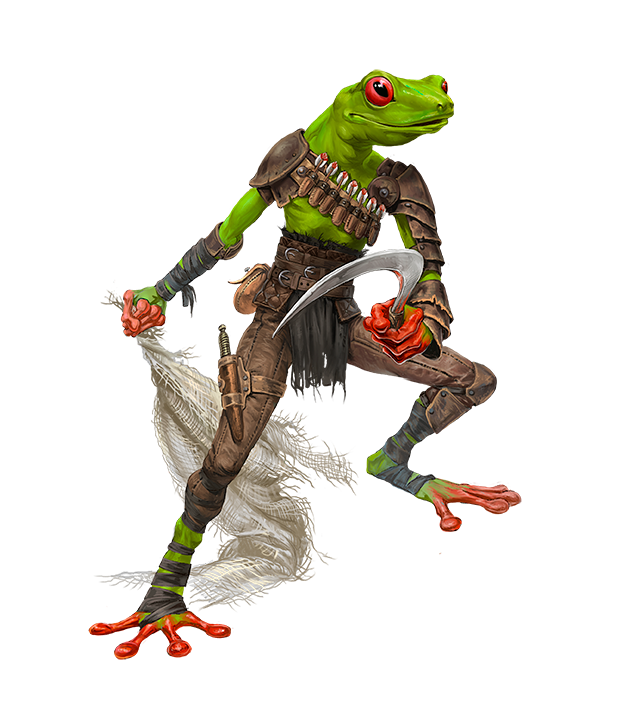 Frog-like humanoids who make their homes in the treetops of tropical jungles and forests, gripplis are uniquely adapted to their environment. Their oversized eyes give them keen vision in both light and dark, and their large toes allow them to easily scale the trees atop which they reside. Gripplis vary widely in physical appearance, their physiologies largely determined by their surrounding environment; those who live in verdant forests, for example, typically have bright green skin and red eyes. In contrast, gripplis who live in regions of rot and decay have mottled brown coloration, and those who dwell near lakes or streams may bear bright blue and orange stripes. Typical gripplis are just over 2 feet tall and weigh approximately 30 pounds.