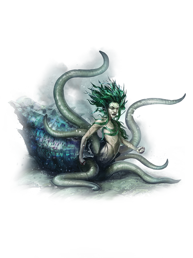 The darkly intelligent vaspercham, an aquatic horror who delights in violence and destruction, lurks in the shallows near shorelines. Once a vaspercham settles on a new home, they stubbornly stay there, regardless of any communities dwelling nearby. A vaspercham's physical might and magic-warping abilities make them incredibly hard to dislodge once entrenched, and many seaside communities have relocated after a vaspercham came calling. The monster responds only to strength, so one must best a vaspercham in combat to gain their begrudging cooperation. But once the creature recovers their strength, they inevitably betray any temporary alliance.