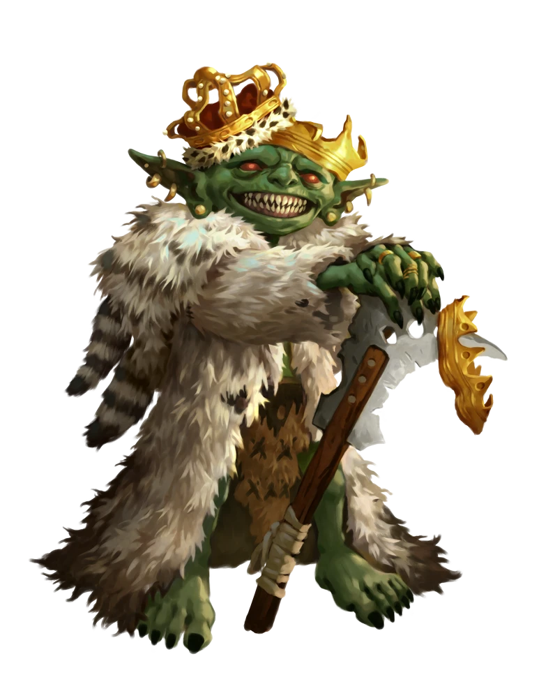 Goblins have many paths to leadership of their bands. Some inherit it, while others earn it by being the strongest, smartest, meanest, most charismatic, or even just plain luckiest. Surviving a fireball that wipes everyone else in a get gang out because they were busy eating a pickle is one way to know you have the goblin hero-gods' favor!