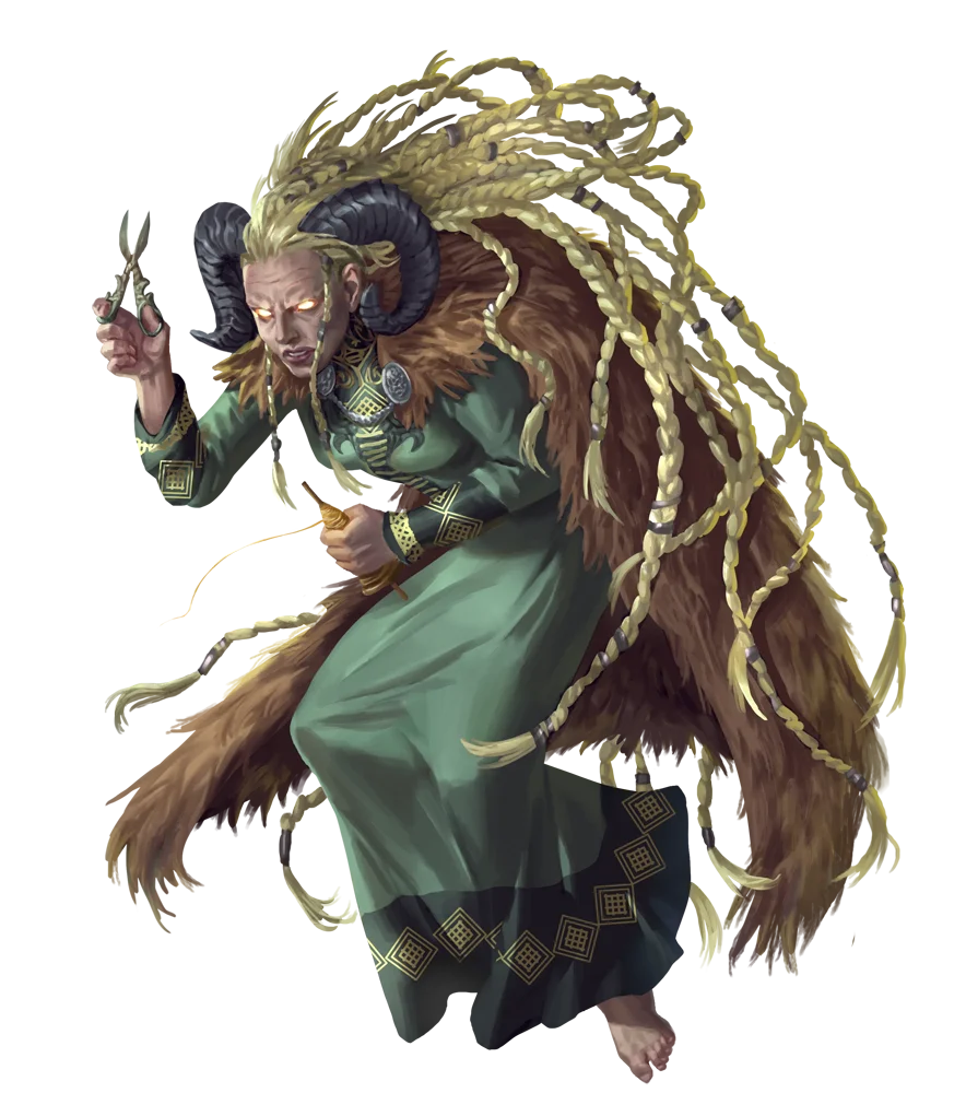 Norns' relationship with the Eldest of the First World is complex. Many among norns serve Magdh the Three, the triune Eldest who some norns believe to be the first norn triumvirate bound together into one entity, as Magdh has three bodies: a Maiden, a Mother, and a Matriarch. Magdh claims to be watching the threads of fate for some ominous prophesied cataclysm, and in addition to assisting in her divinations, Magdh expects the norns who serve her to follow her cryptic commands to help nudge the future away from the brink. However, norns are powerful beings in their own right, themselves capable of granting divine power, and many balk at serving the enigmatic demigod. These norns find the other Eldest even more alien and challenging to interact with, for they believe that while the Eldest wield great power, even these powerful beings should not be granted leave to meddle with fate as much as they desire.