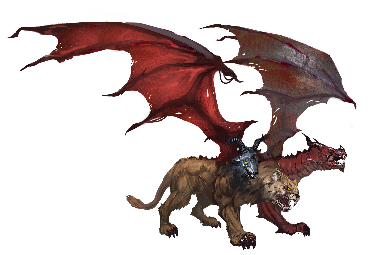 The chimera is the archetypal example of an unnatural monster made up of a monstrous mix of wildly different component creatures: in this case, a lion, a dragon, and a goat. Wild, hateful, and hungry, it tries to eat any creature it sees, but sometimes a strong-willed master is able to compel a chimera to serve as a guardian or even a mount.