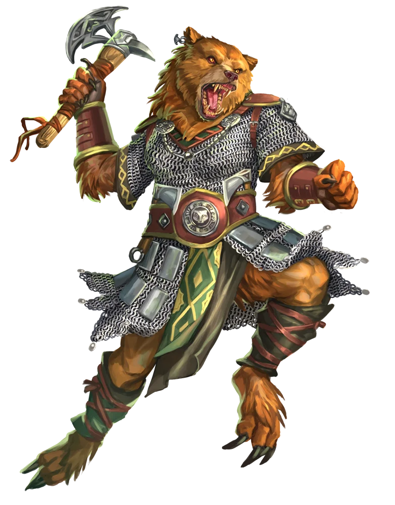 Melee [one-action] claw +13 [+9/+5] (agile, reach 10 feet), Damage 1d10+7 slashing plus GrabMelee [one-action] greataxe +13 [+8/+3] (reach 10 feet, sweep), Damage 1d12+7 slashingMelee [one-action] hatchet +13 [+9/+5] (agile, sweep), Damage 1d6+7 slashingMelee [one-action] jaws +13 [+8/+3] (reach 10 feet), Damage 1d12+7 piercing plus curse of the werebearRanged [one-action] hatchet +10 [+6/+2] (agile, sweep, thrown 10 feet), Damage 1d6+7 slashingChange Shape [one-action] (concentrate, polymorph, primal) Medium human with fist +13 for 1d4+7 bludgeoning, or grizzly bear with Speed 35 feet.Curse of the Werebear (curse, primal) Saving Throw DC 18 FortitudeHunt Prey [one-action] (concentrate) The werebear designates a single creature they can see and hear, or one they're Tracking, as their prey. The werebear gains a +2 circumstance bonus to Perception checks when they Seek their prey and to Survival checks when they Track their prey. The first time the werebear hits the designated prey in a round, they deal an additional 1d8 precision damage. These effects last until the werebear uses Hunt Prey again.Mauler The werebear gains a +2 circumstance bonus to damage rolls against creatures it has grabbed.Moon Frenzy (polymorph, primal)
