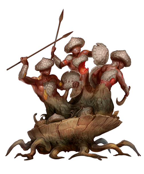 Great fruiting trees grow in massive orderly rows in a region of the Plane of Wood called Armory Grove. Over the course of decades, a regiment tree's branches grow heavy, laden with fruits uncannily shaped like people. They're cultivated by retired warriors whose tireless work ensures that these fruits grow into a form suitable for battle. Their efforts instill tactical knowledge in these fruit warriors so they're prepared to fight as soon as they fall from the tree—which they do simultaneously, forming one battle-ready unit. Each soldier is equal in skill and similar in form, with a wooden outer shell that splits into portions as the flesh of the fruit inside ripens. A slain warrior contains seeds within its body that can slowly germinate in rich soil with enough water—or blood. Every battlefield can become a new garden.