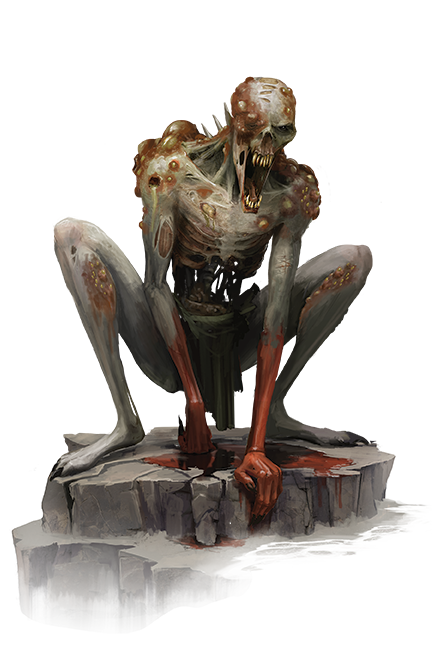 Spawned from corpses of those who died of illness or starvation and twisted by negative energy, festrogs display a visciousness that rivals other undead. They resemble decaying humanoids, but with elongated arms, teeth, and bone-like spikes protruding from their upper backs. Festrogs' tendency to run on all fours has led to them gaining the moniker dog-ghouls, causing the unwary to mistake them for mindless predators.
