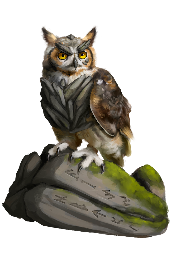 In many stories, the sage guide assumes the form of a large owl whose proud breast is composed of hard stone. This depiction combines the wisdom commonly attributed to the owl with the strength and fortitude of the earth.