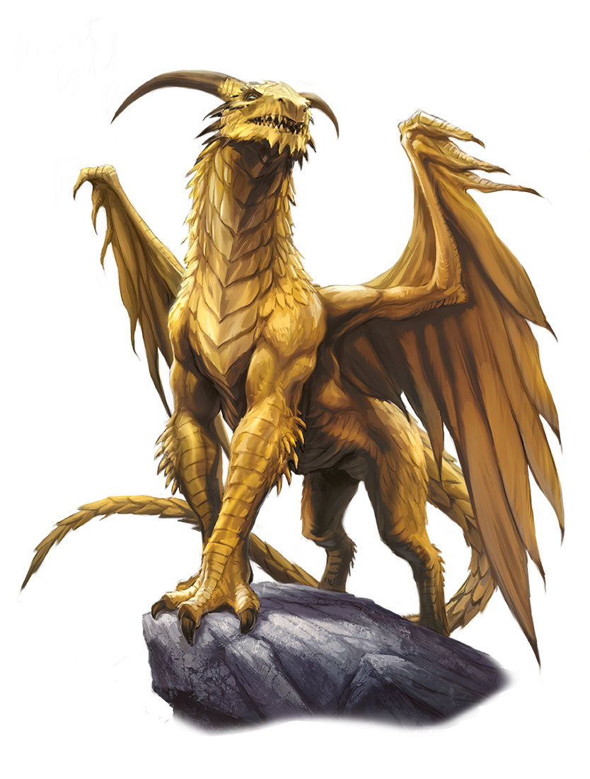 Gold dragons are the epitome of metallic dragonkind, unrivaled in their strength as well as their wisdom. They command the unwavering reverence of all other metallic dragons, who view gold dragons as their leaders and counselors. Golds rival the raw power of even red dragons, much to the chagrin of their chromatic cousins, and the two races are often regarded as bitter rivals. But despite their incredible power, gold dragons are fond of discourse and prefer to talk through solutions to problems rather than rely upon brute strength. Long-lived as they are, they necessarily take a wide view of all situations and never act without considering all possible options and outcomes. Because of this, gold dragons willingly converse with any creature that seeks them out, even evil chromatic dragons. Mortals might find this behavior strange, considering the longstanding war between chromatic and metallic dragons, but dragons know all too well that desperate situations sometimes call for drastic alliances. And although gold dragons might consider brief truces with their chromatic brethren in the case of world-ending threats, they also know when such alliances have run their course.