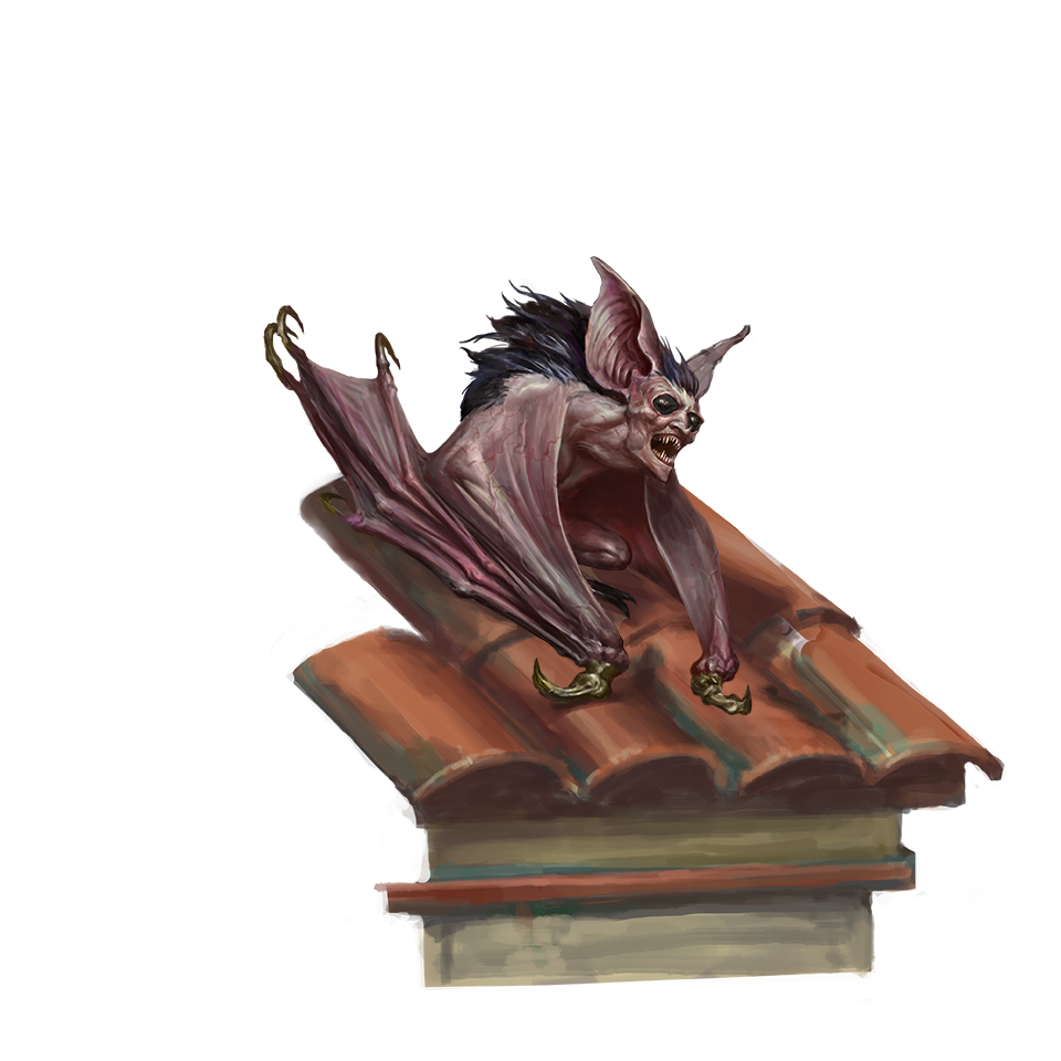 Zrukbats resemble long-limbed bats with gangly wings, which make them clumsy fliers. Instead, these reclusive fey prefer to crawl along surfaces using the hooked talons on the tips of their wings and feet. Their somewhat humanoid faces feature bulging black eyes, dark fur, and pointed fangs, shocking—if not terrifying—those who get a glimpse of them scuttling along a roof or peeping out from under an eave. Sensitive creatures, zrukbats quickly learn that their appearance triggers negative reactions, yet they prefer to live in urban settlements, observing busy streets and houses from inconspicuous locations.