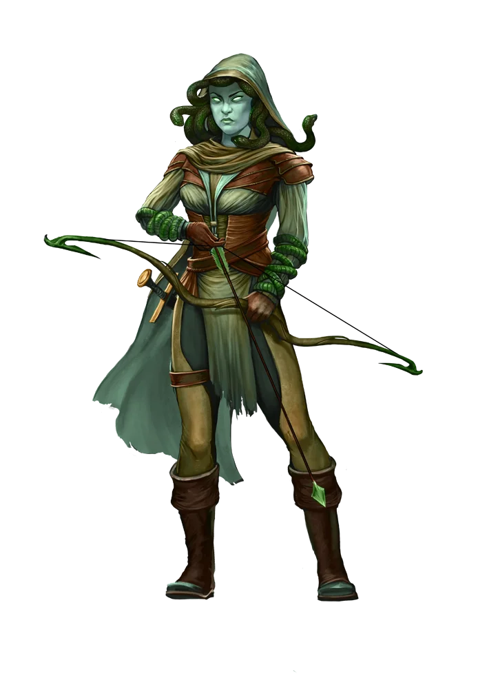Monstrous humanoids that resemble humans with snakes instead of hair, medusas are best known for their petrifying gazes that—if lingered upon— can permanently transform mortals to stone. Medusas are shrewd and manipulative adversaries who collect and covet secrets, and who use threats and guile to exploit the fears of weaker creatures. A medusa may seek out powerful magic items, use divining magic to discover secret knowledge and unlock forbidden power, or infiltrate a society to beguile influential politicians. Their ability to worm their way into powerful organizations makes them natural leaders of criminal outfits and thieves' guilds, and their interest in magical phenomena leads some to pursue careers as oracles who offer to help adventurers find what they seek—for a price. Of course, if wit and deception prove insufficient, a medusa can always simply turn rivals into ornate stone decorations with little more than a glare. Many medusas build elaborate lairs to call home, often decorated with the statues of their foes turned into macabre trophies on prominent display.