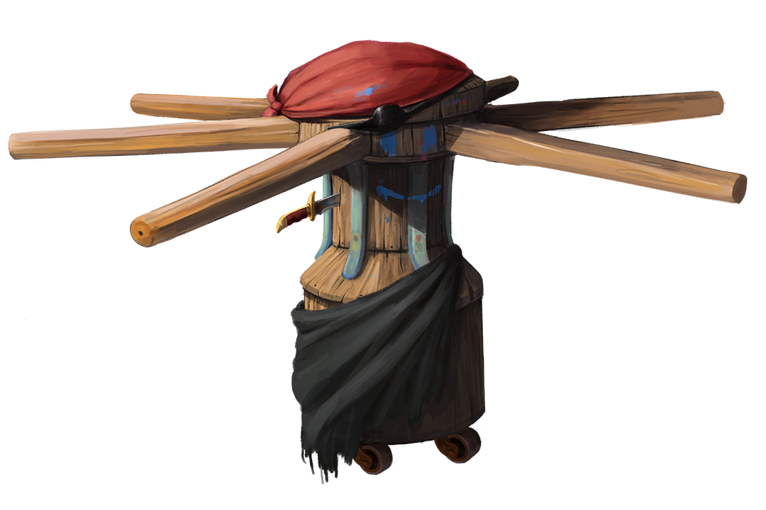 Built to resemble and assume the place of a ship's capstan—the winch that raises and lowers the anchor—a capstan swabbie is a round, stout cylinder of wood wrapped in heavy-duty rope. Spars spaced evenly around its frame complete the look, while castors on its base give the swabbie mobility. A capstan swabbie also sports a few small pegs around its diameter. It can use these appendages to “grab” other ropes from the rigging to help sail the ship. Some crews decorate their capstan swabbies with paint or rags to give the constructs a personal touch.