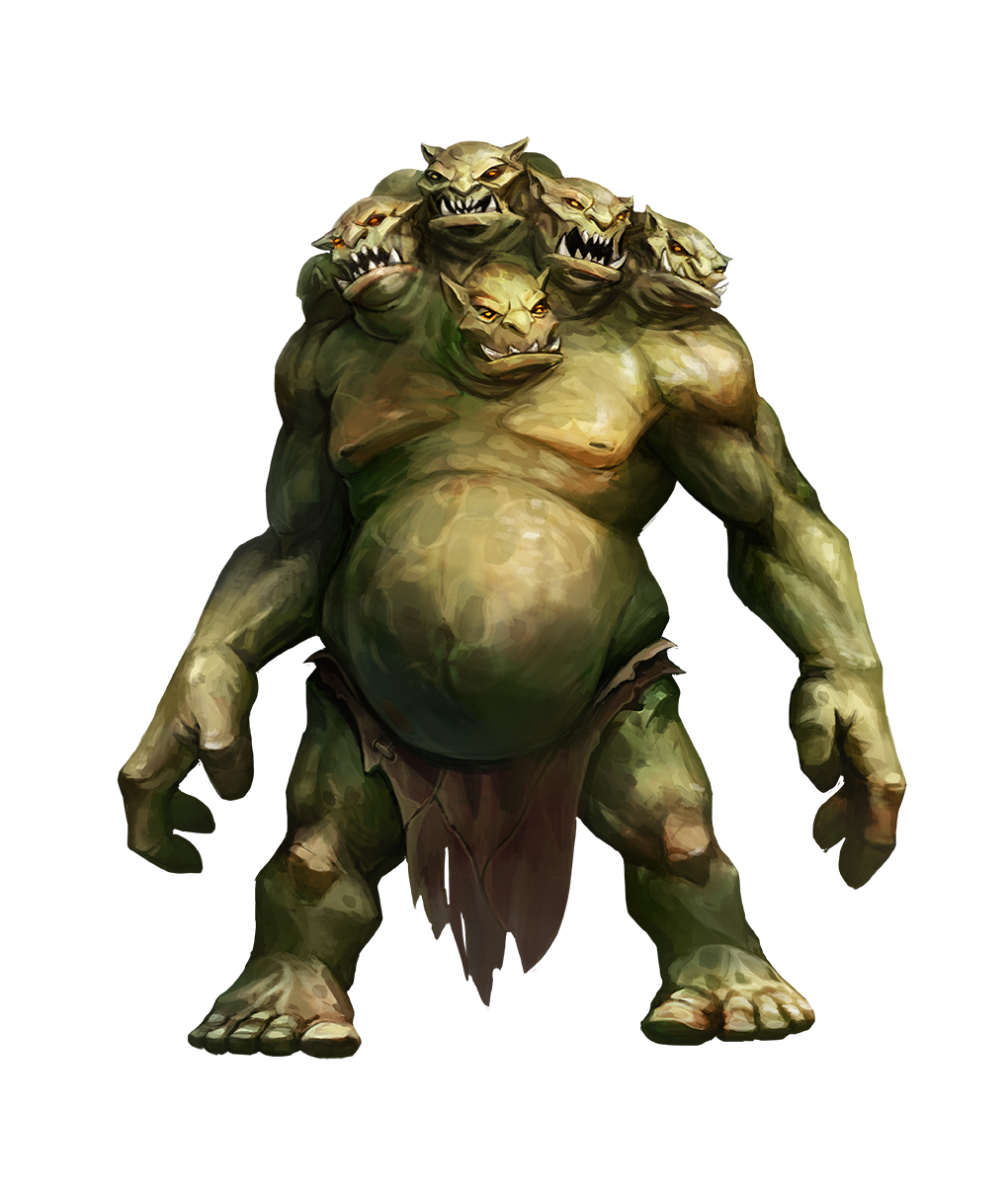 Jotund trolls are gigantic, nine-headed horrors who prowl frigid moors, marshes, and wastelands, always alone and always enraged. While each of the jotund troll's nine heads possess their own brains and senses, they work much more in tandem than the dual-minded nature of the two-headed troll. Despite this, the heads often argue and bicker, particularly over which head gets to eat. The fact that all nine maws lead to the same shared stomach makes little difference in such culinary disagreements.