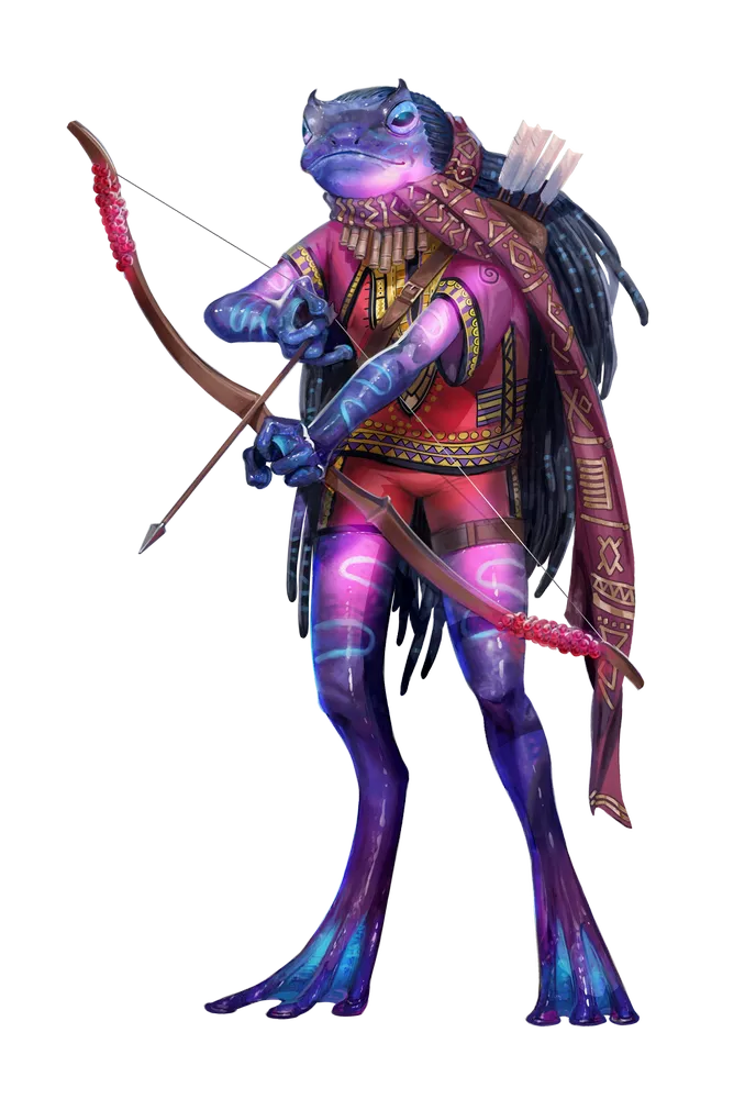 Tripkees are froglike humanoids whose spirit often exceeds their stature.Tripkees are a shy and cautious people who generally seek to avoid being drawn into the affairs of others. Despite their cautious outlook and small stature, adventurous tripkees still take bold and noble action when the situation demands it.