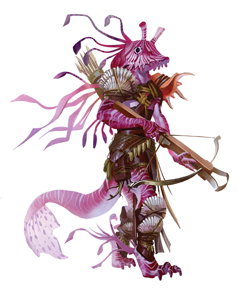 Deep in the sea, schools of athamarus—piscine humanoids armed with spears and specialized crossbows—stalk sharks, sea serpents, and giant squid from the backs of their giant moray eel mounts. The first hunters to strike are armed with barbed harpoons that deploy large fans of seaweed, slowing and exhausting their prey. A daring few athamarus use the embedded harpoon as a handle to ride prey for a short time. Once the creature is tired, remaining hunters finish it with longspears. Athamarus developed this hunting tradition to forge skilled warriors and deter potential attackers, partially in response to centuries of oppression and mistreatment from other aquatic cultures.