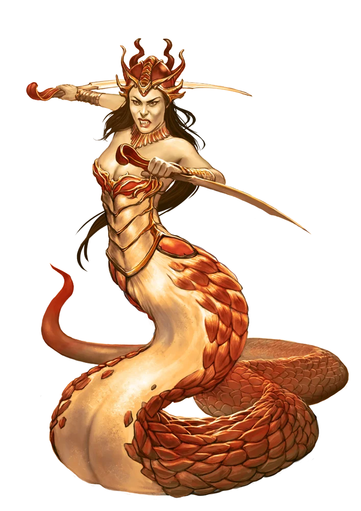 Lamias are bloodthirsty victims of an ancient curse for which they blame the gods. Most lamias are humanoid from the waist up but have the lower bodies of serpents. Sinister magic comes naturally to a lamia, and they prefer the use of illusions to deceive prey for later consumption, or simply to torture.