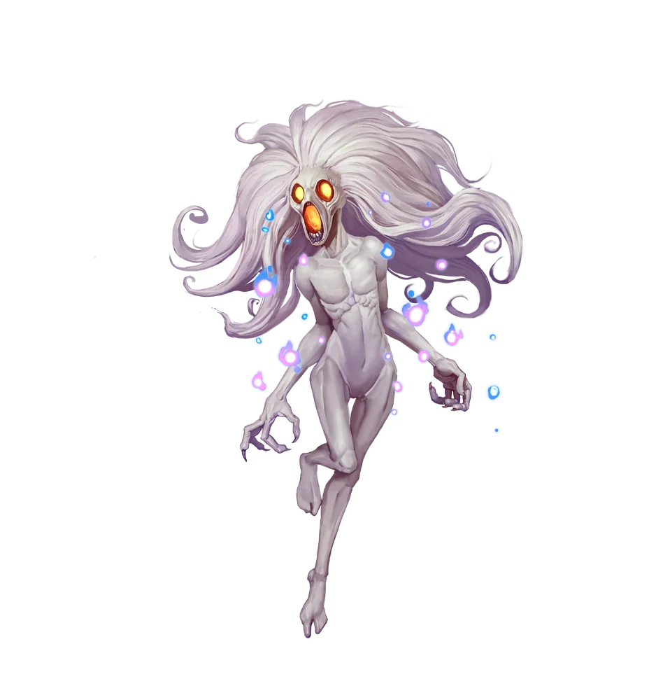 Shining children are wicked, enigmatic monsters that roam remote planes and untraveled corners of the universe in search of esoteric lore. With their abnormally gaunt frames, long white hair, and unnerving, four-fingered hands, shining children are both strangely familiar and otherworldly in appearance, though they are barely visible within the shroud of blinding light they continually emit. Their faces are truly horrible, however, as their overlarge eyes and distended, gaping mouths reveal their heads to be voids filled with unnatural light. Shining children use this light as a weapon, weaving illusions and focusing beams of fiery brilliance.