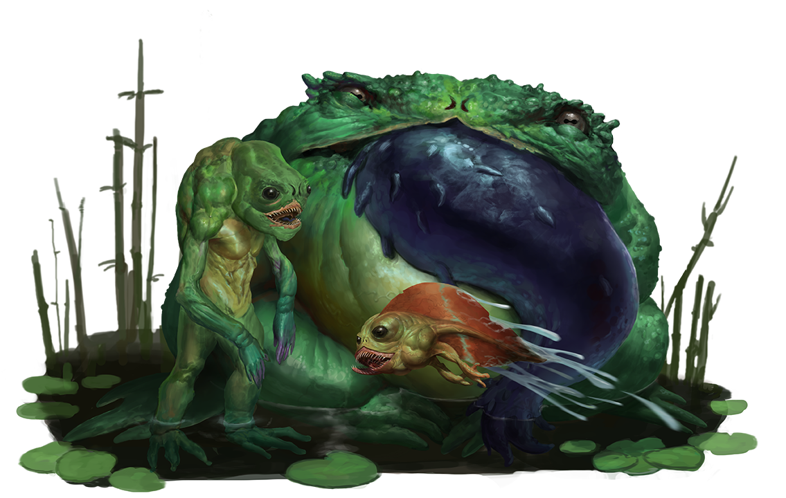 Brughadatches of all life stages tend to cohabitate, since their abilities naturally synergize and tip the odds of survival in their favor. A single brughadatch elder—known as a doblagub—leads a clan, while midlife brughadatches serve as scouts, hunters, and laborers. Gahlepods dwell in large, stagnant ponds and bogs around the brughadatches’ holdings, so they are often the first to interact with creatures that carelessly wander into their domain. Adventurers who make it past these bogs often fail to realize the connection between the gahlepods and the amphibious tricksters further on in the swamp until they encounter the doblagub, who is now roused and commands their brethren in battle.