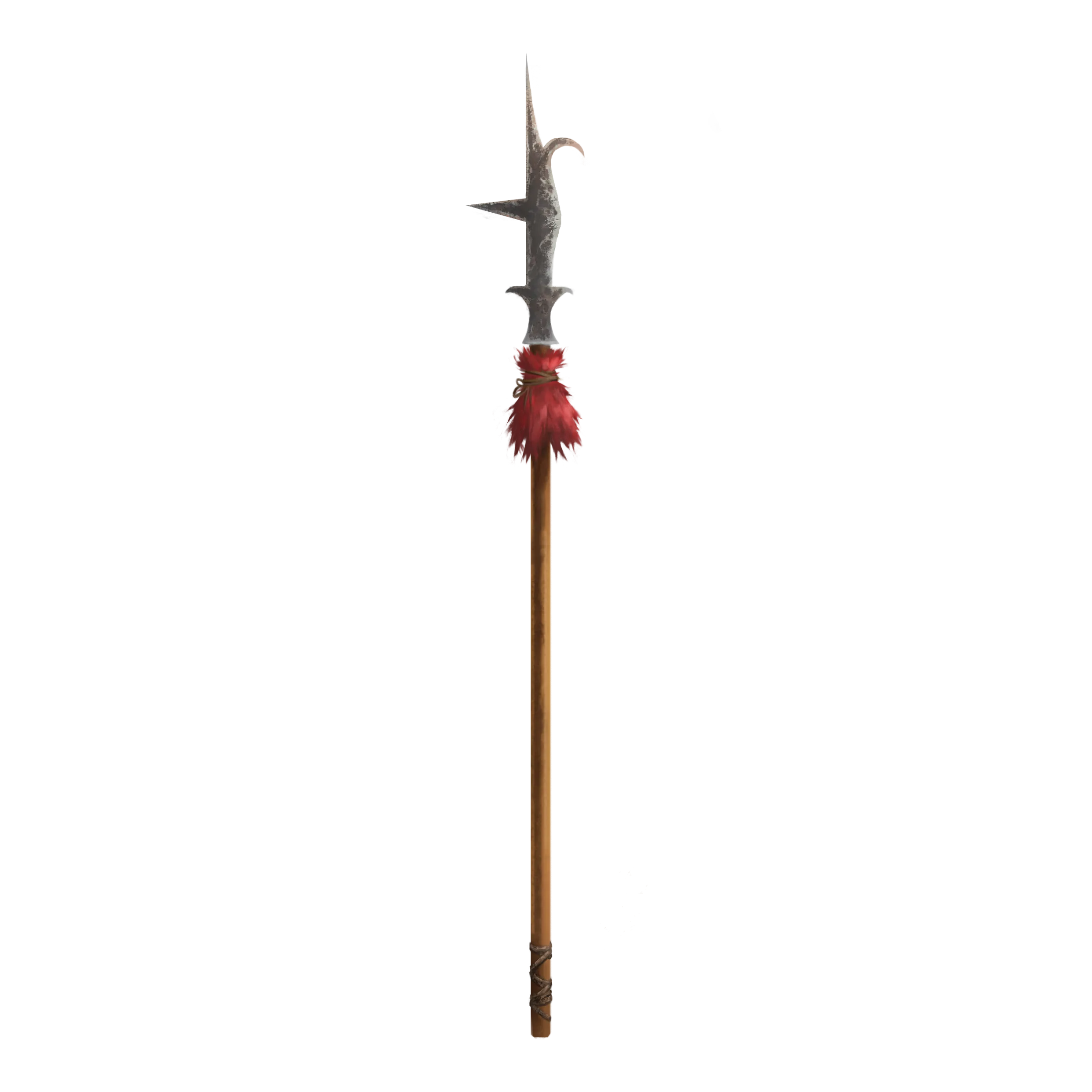 This polearm bears a long, often one-sided, curved blade with a hook protruding from the blunt side of the blade, which can allow its wielder to trip opponents at a distance. Its shaft is usually 8 feet long.