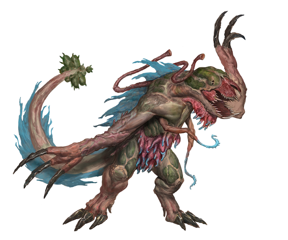 Disgorge Bile [two-actions] (acid, inhaled) The xilvirek retches a small pool of debilitating, acrid bile onto itself. All creatures within 30 feet take 4d6 acid damage as they inhale the bile’s noxious fumes (DC 20 basic Fortitude save; on a failure, the creature is sickened 1, or sickened 2 on a critical failure). The xilvirek can’t Disgorge Bile again for 1d4 rounds.Feasting Tentacles The xilvirek has two tentacles on its back that it can use to suck the life from its prey. A creature that starts its turn grabbed by the xilvirek becomes drained 1, and the xilvirek regains 20 HP. The drained value increases by 1 on each subsequent round that the creature starts its turn grabbed, but the xilvirek doesn’t regain additional HP from draining the same creature more than once per day.