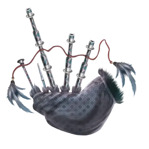 The main portion of this set of bagpipes is fashioned from the dried skin of a cauthooj, with the feathers still attached. The bird’s vocal cords are crafted into the instrument’s reeds. The pipes grant a +2 item bonus to Performance checks while playing music with them.