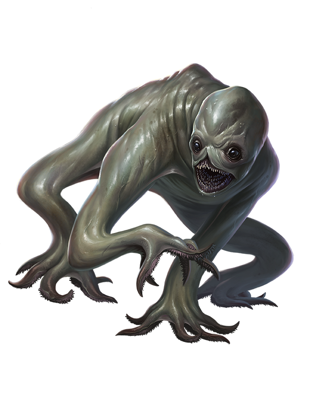 With long, cartilaginous limbs and gray skin, chokers easily hide in stony alcoves, rocky fissures, and darkened staircases to ambush their prey. The strange little aberrations prefer to pick off weak and solitary creatures, especially those that wander off from their packs or communities. A choker's long, spongy arms are flexible but deceptively strong. The fingers can tighten rapidly and are ridged with spiky, tooth-like structures that provide an incredible grip. A choker typically strangles its prey to death, then drags the body off or dismembers it using crude tools if the body is too big to carry. If confronted or outnumbered, a choker tries to escape, often compressing into a tight passage to get away. Chokers that encounter humanoids exhibit intense curiosity about their culture, society, and the products of art and industry. This interest isn't very deep—it just results in chokers that like killing people and collecting any of their items that seem sophisticated, such as jewelry, nice clothing, or written texts.