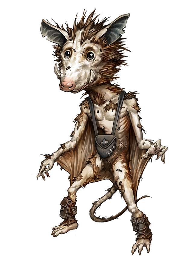 Grimples resemble humanoid, mange-ridden opossums, with boar-like tusks that aid them in rooting through garbage heaps for food. They are agile climbers who glide from eave to eave on the loose flaps of skin between their limbs. Savvy gremlin-hunters know to look for the skin flakes and fur grimples shed from their parasite-infested hides.