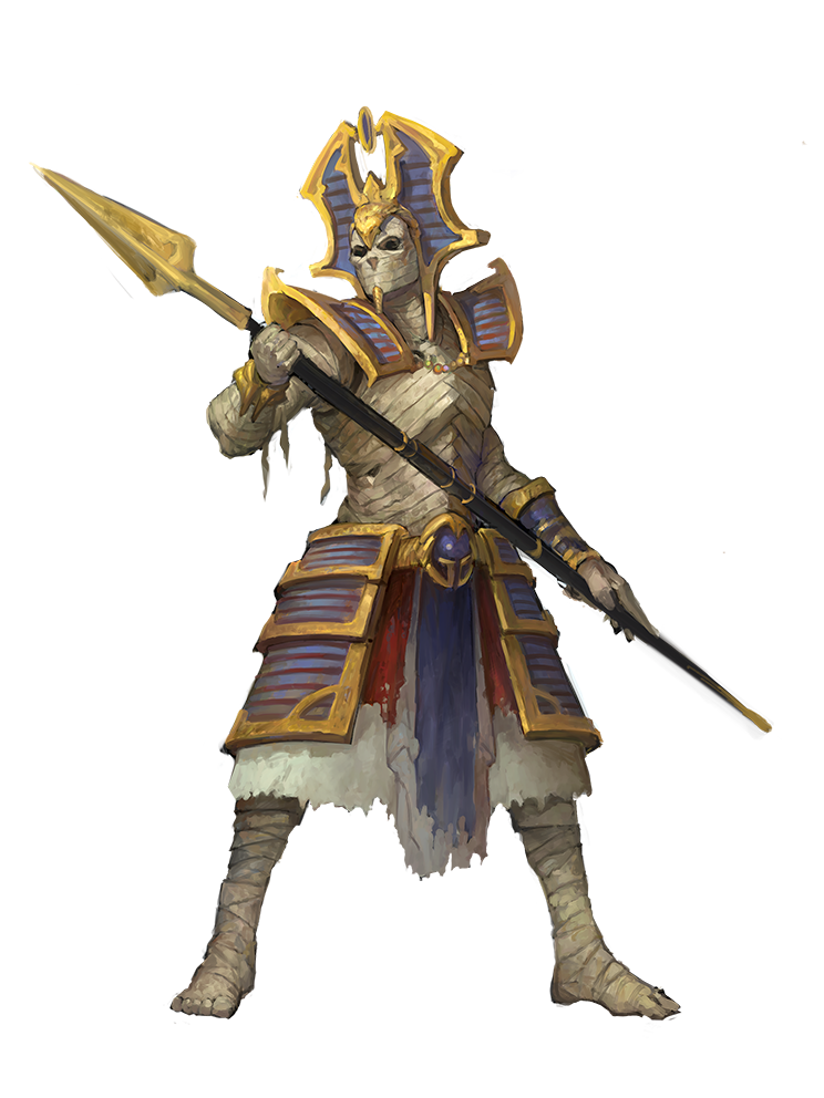 Great Despair (aura, divine, emotion, enchantment, fear, incapacitation, mental) 30 feet. Living creatures are frightened 1 while in a mummy guardian’s despair aura. They can’t naturally recover from this fear while in the area but recover instantly once they leave the area. When a creature first enters the area, it must succeed at a DC 26 Will save (after taking the penalty from being frightened) or be paralyzed for 1d4 rounds. The creature is then temporarily immune for 24 hours. Rejuvenation (divine, necromancy) When a mummy pharaoh is destroyed, necromantic energies rebuild its body in its tomb over 1d10 days. If the re-forming body is destroyed during that time, the process starts anew. A slain mummy pharaoh can be destroyed for good with a consecrate ritual. Undead Mastery (aura, divine, necromancy) 100 feet. Commanded or allied undead in the aura that have a lower level than the mummy pharaoh gain a +1 circumstance bonus to attack rolls, damage rolls, AC, saves, and skill checks. Attack of Opportunity [reaction] The mummy pharaoh can use Attack of Opportunity when a creature within its reach uses a concentrate action, in addition to its normal trigger. It can disrupt triggering concentrate actions, and it disrupts actions on any hit, not just a critical hit.