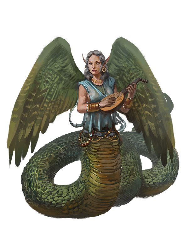 Lillends are tale-tellers, chroniclers, and champions of freedom of expression. They are generally peaceful, but are quick to act if a masterful piece of art is threatened or free speech is suppressed. They pride themselves on inspiring mortals to greater heights of expression and creativity, and more than one bard looks to a lillend as their personal inspiration. Lillends sometimes secretly follow the adventures of mortal heroes to record their stories as epic poems and songs, which they then perform in the packed mead halls of Elysium. When pursuing such goals, lillends take pains to use their innate spells to remain in hiding, as they would rather observe and record events without “polluting” them with their own intervention. Nevertheless, a lillend who sees their charge faced with certain death often cannot resist the urge to intervene and save the day. Inevitably, this brings a close to the lillend’s chronicles, as their relationship with their subject invariably shifts from one of detached observation to friendship or more. Yet lillends remain hesitant to involve themselves for overlong in a mortal’s life, in part because they fear what sort of fiendish attention their presence might attract, but mostly out of respect for the mortal’s own destiny. A lillend would, all things being equal, prefer to let mortals choose their own fate rather than run the risk of sending someone down a path to which their heart is not set.